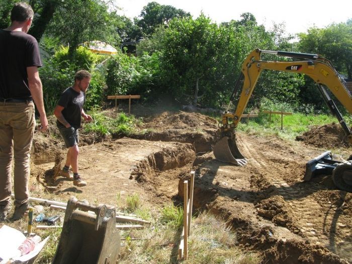 Nous mettrons en œuvre les bottes de paille par l’intérieur : pas de stress en cas d’averse, on pourra travailler au sec. Seul l’enduit devra être préparé dehors.
