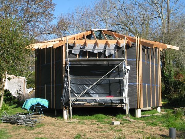 Hexagone de 50m2. Ossature bois faite par des professionnels. Chantier participatif pour : poser les bottes de paille, faire des cloisons en terre-paille, et faire les enduits terre sur les murs à l’intérieur.
