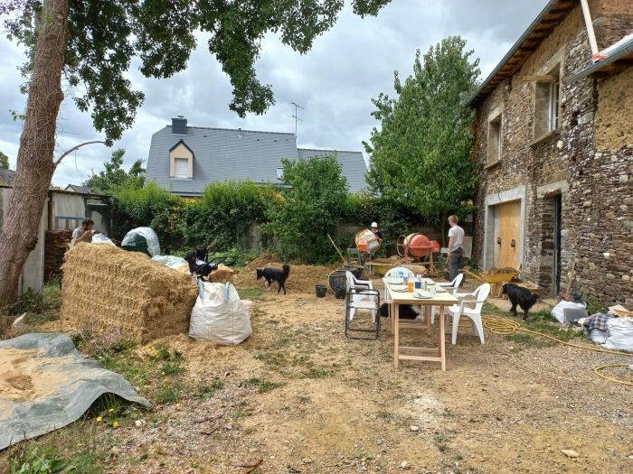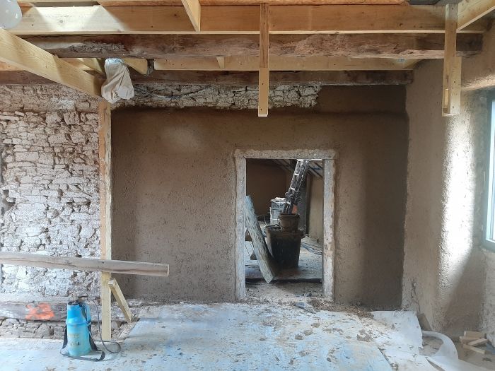 Auparavant la maison était occupée par un couple de retraités, qui avait fait le choix d’utiliser des matériaux “modernes” pour l’aménagement et la rénovation. Afin de respecter la construction d’origine, nous avons fait le choix de mettre à nue la maison et avons réalisé un gros travail de déconstruction depuis septembre pour ne garder que les murs et la charpente. Depuis début 2022, nous avons entamé la reconstruction, aidé pour certaines tâches par des artisan.es profesionnel.les. Nous espérons pouvoir emménager d’ici la fin de l’année 2022, même si tout ne sera pas parfait !