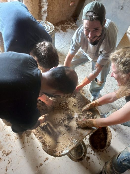 Le travail consiste à réaliser le mélange (terre d’argile, paille concassée, sable et eau) à l’aide d’une bétonnière, transporter la mixture aux pieds des murs, et appliquer celle-ci sur les murs en plusieurs passes.