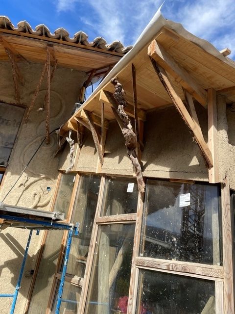 La charpente, les bottes de paille sont posées, les enduits de corps sont réalisés, reste les chapes de terre, les cloisons, la toiture, les enduits de finitions
