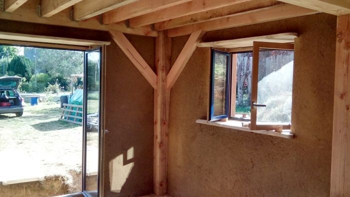 La semaine sera consacré à la pose d'une seconde couche d'enduits de corps en terre et nous fignolerons les cloisons en torchis avec un pro des enduits.
