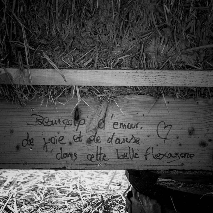 Cette charpente construite avec les arbres du terrain et actuellement montée au sol.