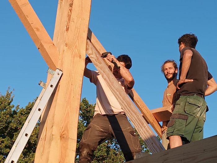 La prochaine phase du chantier, prévue pour début août 2025, se concentrera sur la pose de la volige et de l'isolation en paille. Nous achèverons ensuite avec la pose des tuiles à suivre !