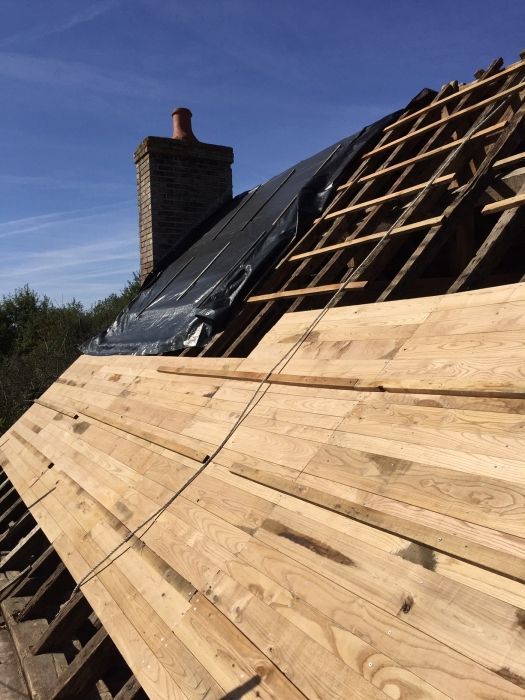 Le platelage est en châtaignier, en bout de 1,60m à ajuster sur les chevrons. On pose ensuite un pare-pluie jointoyé avec l'adhésif approprié et fixé avec liteaux.