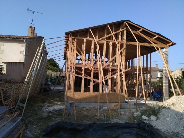 Au mois de mai, j’ai réalisé avec quelques ami-es le sous-bassement. Puis depuis début juin nous avons monté l’ossature GREB et la charpente avec Pierrot.