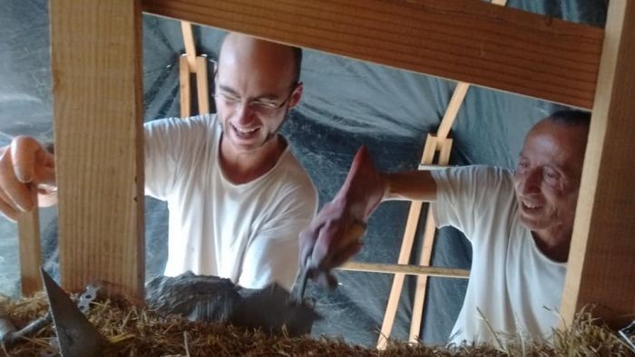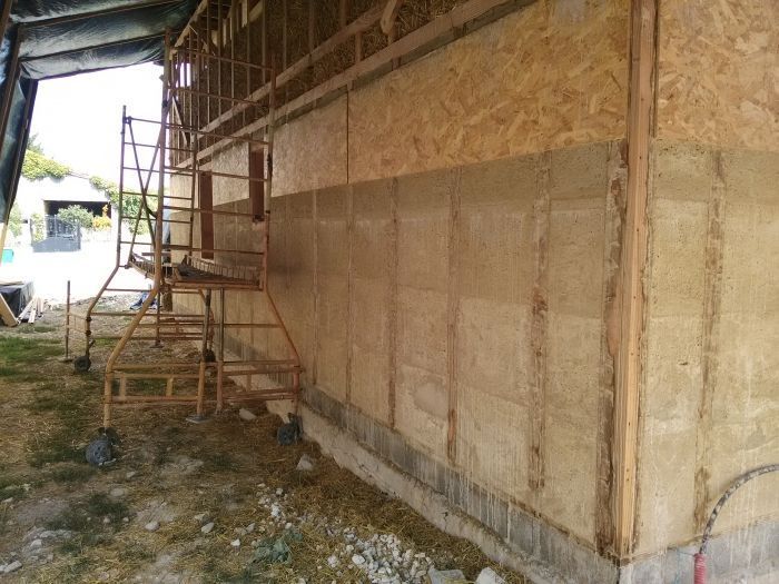 Il est donc venu le temps d’habiller cette grande dame pour l’hiver. Le chantier participatif de cette année consiste à poser les bottes de paille dans l’ossature GREB et de couler le mortier au fur et à mesure, puis de poser les bottes entre chevrons pour isoler le toit.