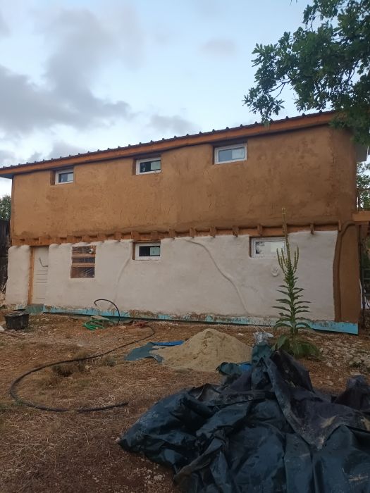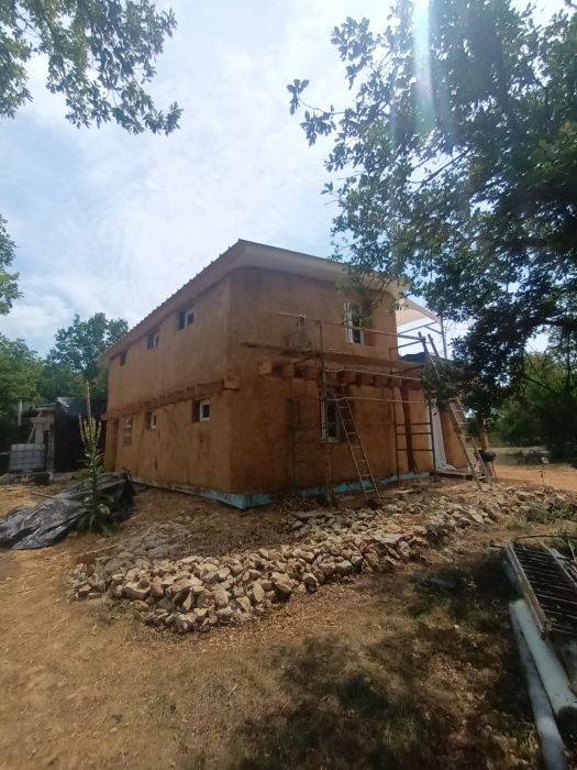 En ce qui me concerne, la maison est hors d'eau et air, la 1ère couche de badigeon est posée et la prochaine étape est la pose de la couche de corps extérieure.