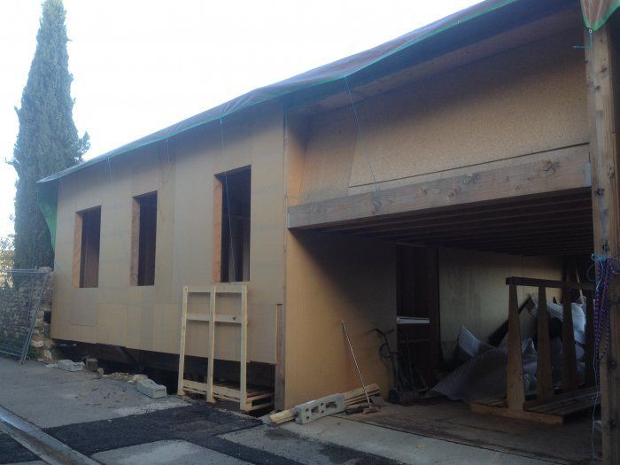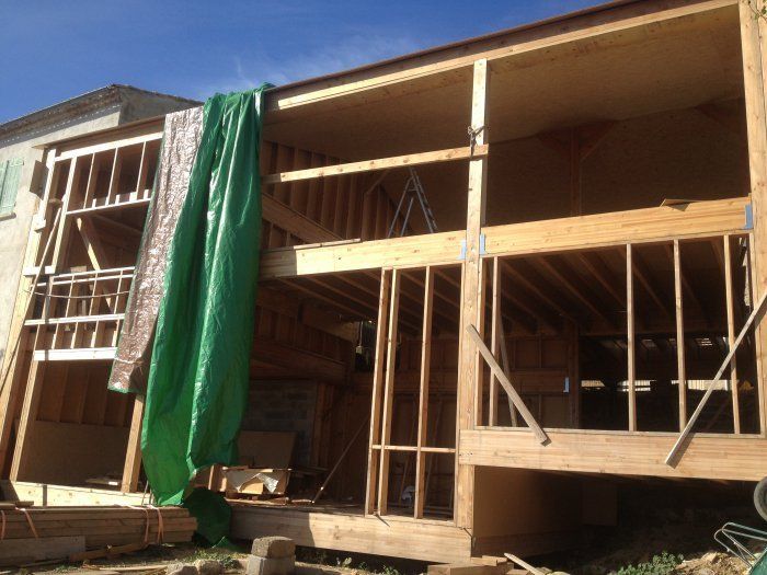 La maison est actuellement quasi hors d'eau,( toiture en paille/pare pluie rigide+bâche pour l'hiver), hors d'air (menuiserie posé mais pas l'OSB définitif du sol).