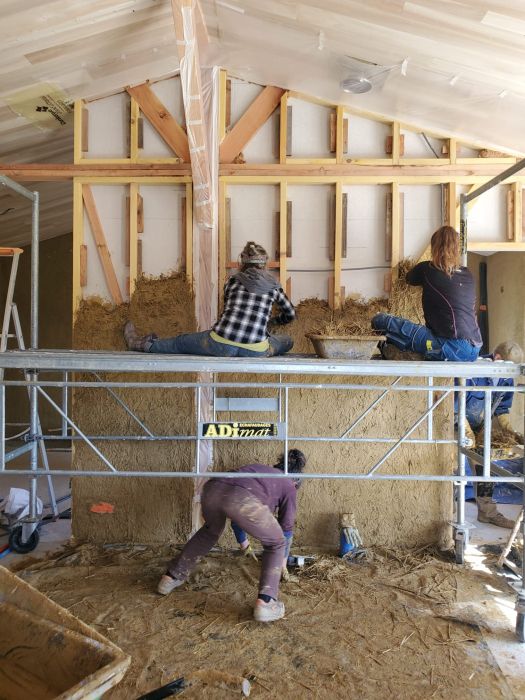 La construction de ma maison de plain-pied a débuté fin mai 2024. C’est une petite maison : 10mx7,20m et 3,50m de hauteur. L’ossature bois a accueilli les bottes de paille dans les murs. Les tuiles sont maintenant posées et le bardage réalisé sur 2 façades. Les enduits extérieurs et intérieurs, 1ère couche de corps, sont réalisés. Je fais beaucoup de récup pour diminuer les coûts et parce que le recyclage a du sens pour moi : fenêtres, portes, poêle, tuiles, et plus encore, sont de la récup.