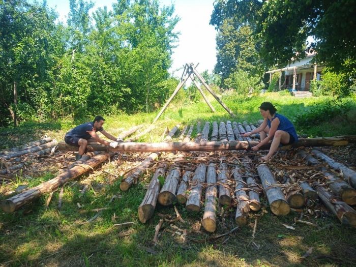C'est avec plaisir que nous rouvrons à nouveau le chantier pour la préparation des enduits qui habilleront les murs courbes de notre paillourte en paille porteuse.