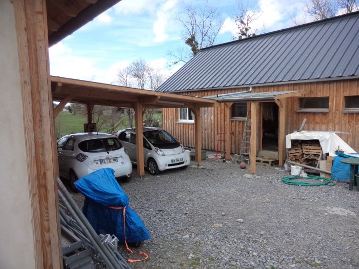 Le terrain sur lequel la maison prend place est à une cent cinquantaine de mètres des bâtiments de l’écolieu. Un hangar/atelier y a été construit en 2021 et sert aujourd’hui principalement de stockage à la paille et d’hébergement de passage.