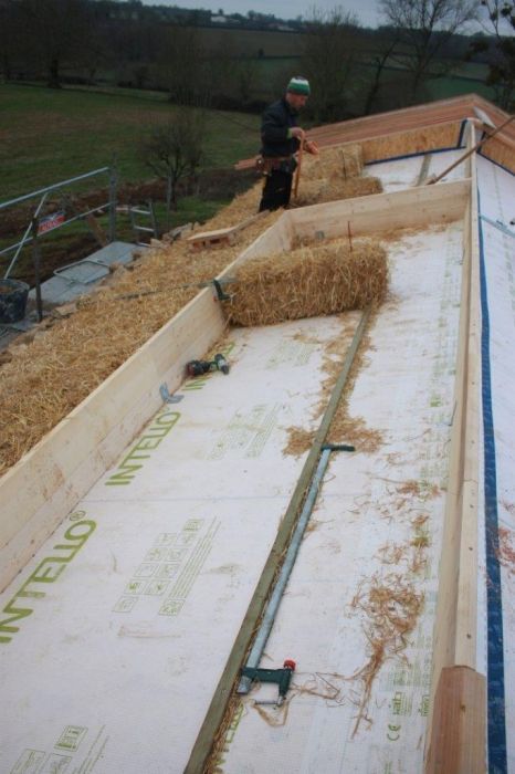 Isolation de la toiture en bottes de paille, enduit terre paille sur mur chauffant pour une meilleure accumulation et répartition de chaleur et mur paille déjà enduit de terre paille, de séparation de la longère entre petite et grande habitation (où nous vivons et nous vivrons ;)