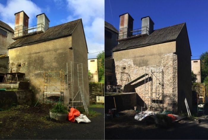 - Décrépissage de la future salle des fêtes, pour révéler la pierre du bâtiment le plus historique (au moins 300 ans d'âge)