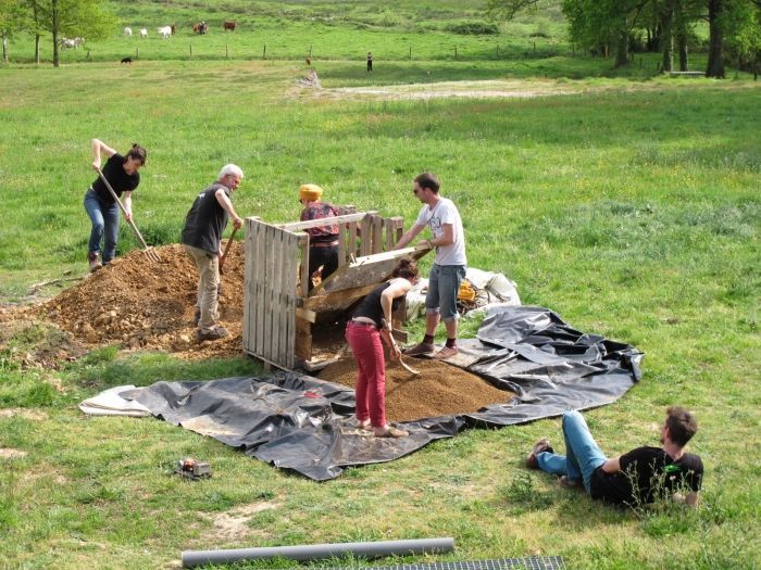 Fabrication d'adobes terre du jardin + roseau pour un mur en terre intérieur