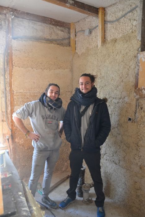 Poursuite de l'isolation de la cuisine qui est fait avec chaux/sable/chènevotte à la main et en coffrage.