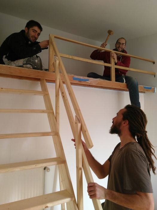 Des toilettes sèches, une cloison et un joli nid perché réalisés grace a mes 3 menuisiers de la semaine : Charles, Pablo et Cyrille :)