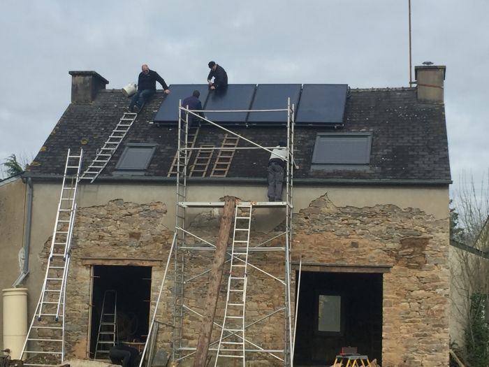 le système de chauffage : 10 m2 de panneaux solaires pour l'eau chaude et le chauffage + une chaudière a granulés ballon d'accumulation de 500 litres. Tout ça pour alimenter le plancher chauffant sur dalle terre crue et les radiateurs en fonte en basse température . Les photos sont...Afficher la suite le système de chauffage : 10 m2 de panneaux solaires pour l'eau chaude et le chauffage + une chaudière a granulés ballon d'accumulation de 500 litres. Tout ça pour alimenter le plancher chauffant sur dalle terre crue et les radiateurs en fonte en basse température . Les photos sont d'aujourd'hui.