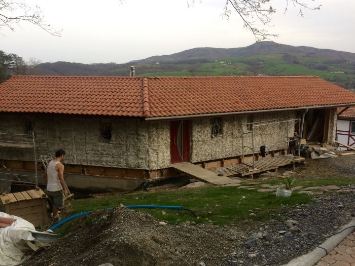 En...Afficher la suite Dernière semaine avant confinement très efficace grâce à la participation active d’Antoine et Simon. Au programme de cette semaine il y a eu la pose de le première couche d’enduit chaux sur les bottes de paille, ainsi que la création d’un escalier pour aller à la yourte.