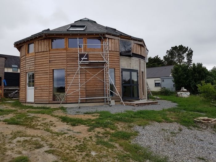 En août, nous envisageons le bardage bois à terminer, les débords de toiture, la 2è couche des enduits intérieurs, et les enduits sur la paille à l'étage.
