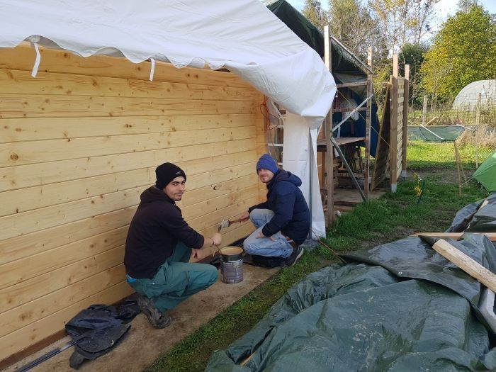 Nous voilà à la partie supérieure du chalet,les murs ont poussés le Barnum... Pas de répis pour moi , les twizzers se suivent et chacun, chacune amènent leurs compétences et bonne humeur. Alexis a cédé la place à Sabine très décidée et motivée pour poser la toiture avec Eliot toujours aussi combatif avant la pause... et malgré le retour de la pluie ...