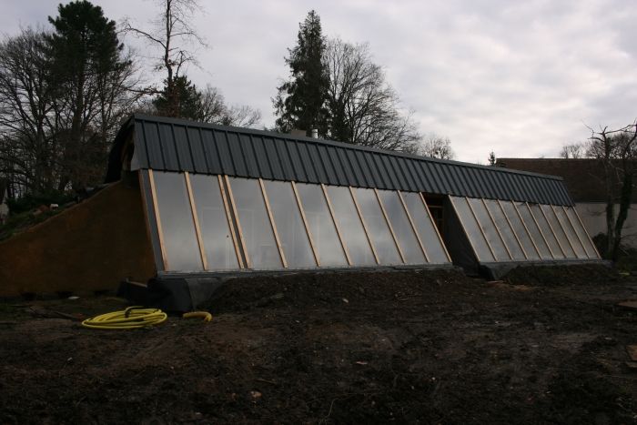 La serre prend forme avec l’installation d’un système de répartition des eaux grises à l’intérieur de la fosse qui accueillera les végétaux, et le début de la mise en place de l’isolant (verre cellulaire – les petits cailloux gris) et de la terre végétale.