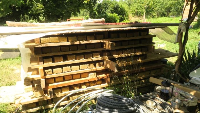 Pendant que les briques fraichement moulées sèchent, le parquet se pose tranquillement.