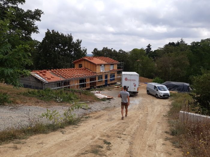 Coline B. sur son chantier Pose de la paille sur les murs...