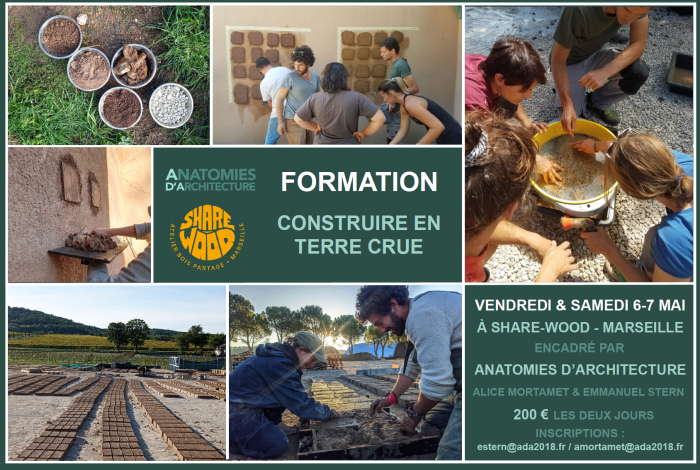 Si vous êtes curieux, auto-constructeur ou professionnel du bâtiment et que vous voulez découvrir ce matériau écologique et plein de surprises, venez nous rejoindre...Afficher la suite Le 6 et 7 mai prochain, nous organisons une formation d'initiation à la construction en terre crue à Share-Wood Marseille!