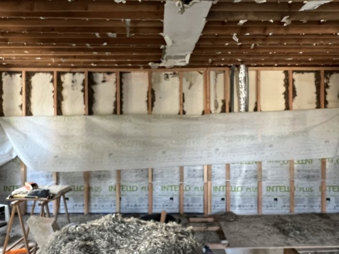 Un grand merci à tous les participants : Fabienne, Anaïs, Christophe,...Afficher la suite Isolation en chanvre en vrac finie... Deux semaines de travail pour remplir des caissons (structure en douglas et membranes Pro Clima) avec 2 tonnes de Chanvre en vrac récoltés à Pontchateau. Circuit court et écologique !