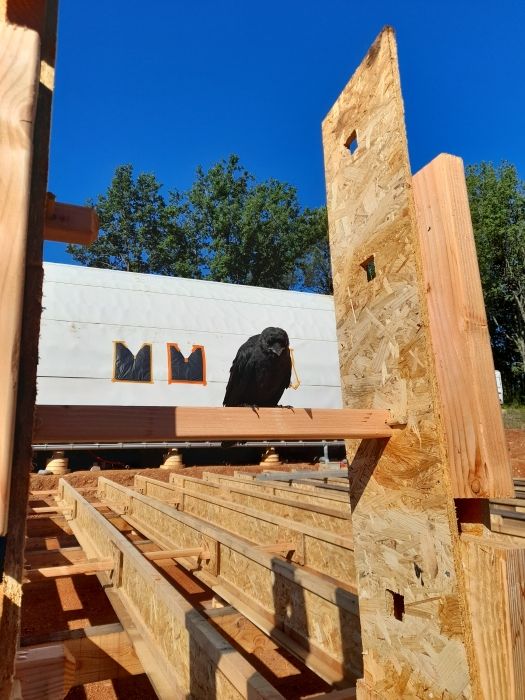 Le montage des arches a commencé ce matin, avec l'aide de Gaston, bébé choucas tombé du nid et qui supervise les travaux...