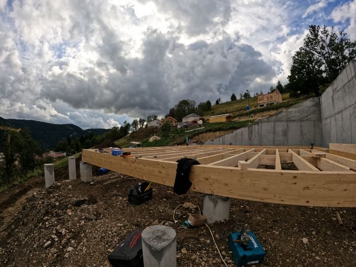 Montage de la dalle en une journée, par manque...Afficher la suite Le travail avance ! La dalle bois se dessine.