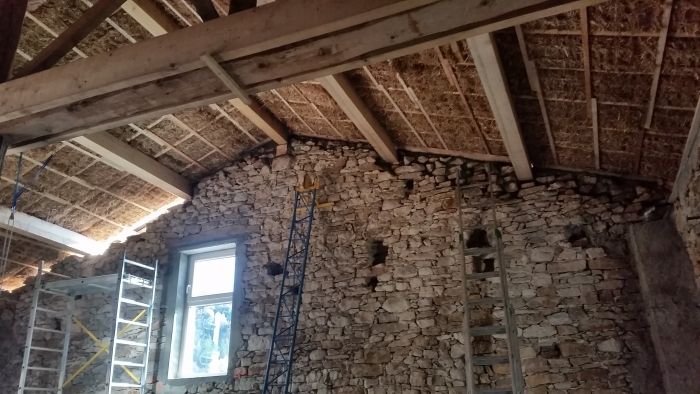 Bonjour tout le monde, ça fait un moment que je n'ai pas pris le temps de donner des nouvelles. Le chantier à bien avancé depuis, la toiture est finie (heureusement vu la neige qu'il y a maintenant), il nous aura fallut 4 types de tuiles différentes et beaucoup de patience pour y arriver! On a...Afficher la suite Bonjour tout le monde, ça fait un moment que je n'ai pas pris le temps de donner des nouvelles. Le chantier à bien avancé depuis, la toiture est finie (heureusement vu la neige qu'il y a maintenant), il nous aura fallut 4 types de tuiles différentes et beaucoup de patience pour y arriver! On a encore casser des murs et fait apparaitre la pierre de la maison.