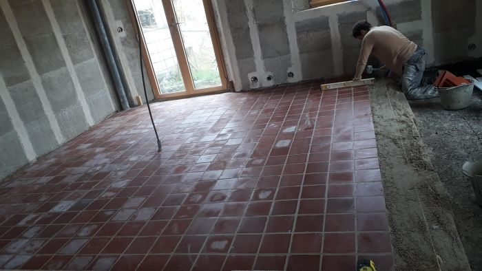 Nous terminons la pose des tomettes dans la cuisine, et dans notre espace tampon.