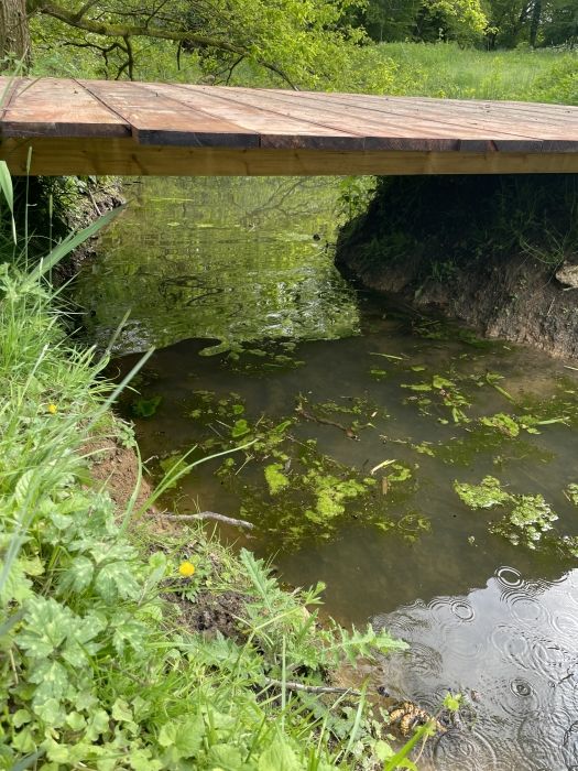 Le pont est désormais fini. Maxime et Amélia ont calculé le nombre de solives nécessaires pour le passage d’un véhicule, et effectué le placement des poutres sur les deux berges. Nous avons coulé du béton pour maintenir en place les solives et les protéger de l’humidité de la terre....Afficher la suite Le pont est désormais fini. Maxime et Amélia ont calculé le nombre de solives nécessaires pour le passage d’un véhicule, et effectué le placement des poutres sur les deux berges. Nous avons coulé du béton pour maintenir en place les solives et les protéger de l’humidité de la terre. Elles ont été traité à l’huile de lin. Puis les planches de Sequoia ont été clouées et, sur la bonne idée de Maxime et Amélia, nous avons disposé une arche au milieu du pont qui permet d’encadrer le passage au-dessus des douves en eau.
