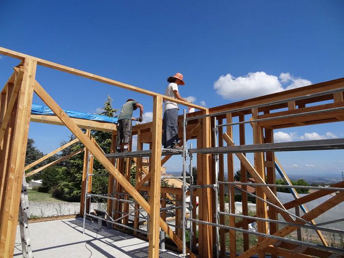 L'ossature bois du rez-de-chaussée est quasi terminée, reste quelques murs intérieurs et leurs écharpes à terminer. Non on ne tricote pas ici ! ;)