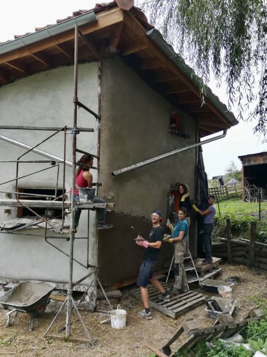 En attendant, petit aperçu de l’avancée actuelle (enduits de finition extérieurs terminés!!! Youhouuu!) et de cette super équipe!!