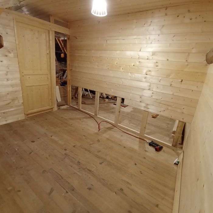 Coucou ! Tu veux voir où j'en suis ? J'ai avancé sur la pose du lambris. Possible seule mais... Tu veux mon avis ? À deux c'est très simple, seule c'est quand même un peu galère. Alors si tu veux découvrir comment on pose le lambris... Il reste une partie des murs des combles et, pour chaque...Afficher la suite Coucou ! Tu veux voir où j'en suis ? J'ai avancé sur la pose du lambris. Possible seule mais... Tu veux mon avis ? À deux c'est très simple, seule c'est quand même un peu galère. Alors si tu veux découvrir comment on pose le lambris... Il reste une partie des murs des combles et, pour chaque cloison, il en faut des deux côtés. Comme tu peux voir, on a encore de quoi s'amuser.