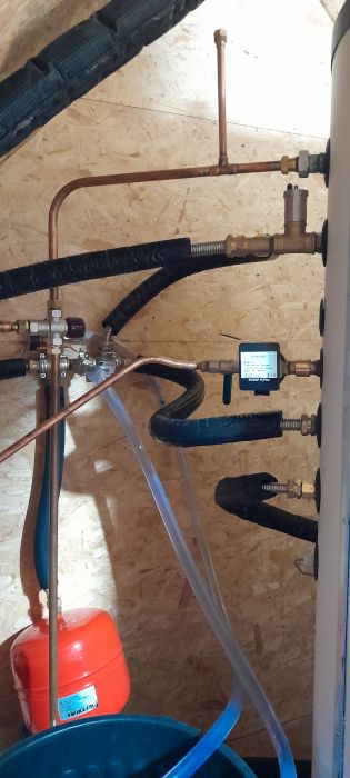 La triple alimentation du ballon d'eau chaude est finie et opérationnelle. Pour rappel, notre ballon de 500 litres est chauffé par