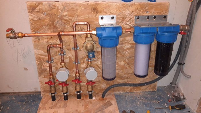 Avec l'aide de Bruno, nous avons commencé la plomberie. Les départs en cuivre sont faits, reste la suite en multicouches. Le circuit n'est pas simple car nous avons, en plus de l'eau du réseau, l'alimentation des toilettes et du lave linge par l'eau de pluie. Il y a également un départ de...Afficher la suite Avec l'aide de Bruno, nous avons commencé la plomberie. Les départs en cuivre sont faits, reste la suite en multicouches. Le circuit n'est pas simple car nous avons, en plus de l'eau du réseau, l'alimentation des toilettes et du lave linge par l'eau de pluie. Il y a également un départ de l'eau de pluie vers un robinet extérieur et la possibilité de remplir automatiquement la citerne avec de l'eau du réseau si celle-ci venait à être vide. Cela nous permet de ne tirer qu'un seul réseau pour l'eau de pluie.