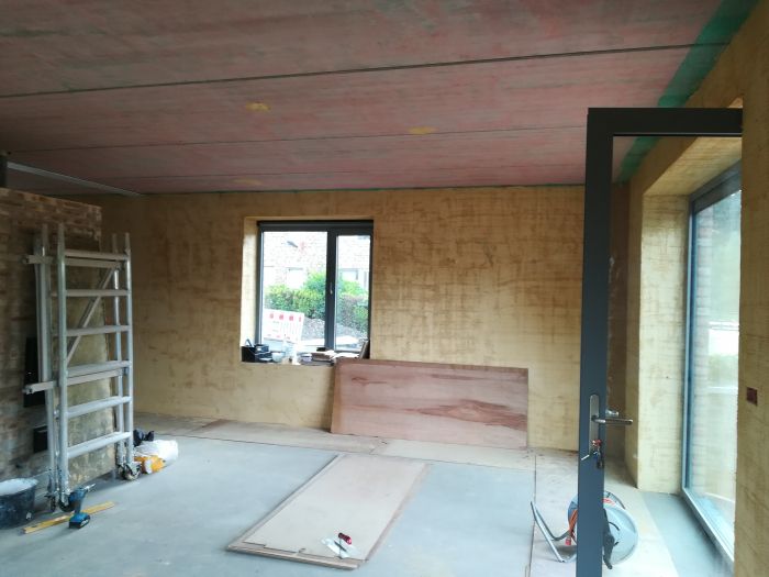 C'est une maison neuve située à Marche en Famenne, où nous sommes en train d'enduire 350m2 de murs et plafonds à la chaux.