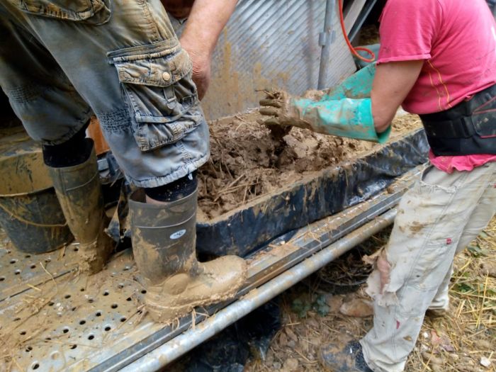 Merci à David, Pascal, Véronique, Clémence, Thomas, Vincent, Pierre et Marc pour votre...Afficher la suite Préparation de terre-paille dense qui remplit les cloisons intérieures de la maison : dans un bac étanche, on met la terre, de l'eau, de la paille, et on malaxe le tout avec les pieds et/ou les mains !
