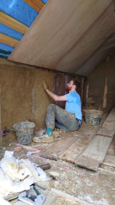 Remplissage de terre-paille dense dans les cloisons intérieures de la maison : en cours, à fond, à l'étage !