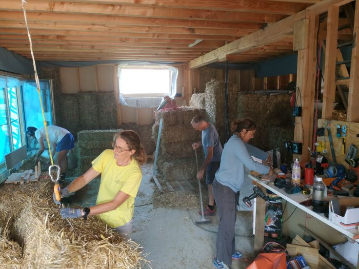 Ça sera peut être pas la même...Afficher la suite Youpiiii, on a commencé la mise en place de la paille ! Bon, il a fallu se roder un peu, trouver les bonnes les techniques, les bonnes manière d'utiliser les chausses bottes et le persuadeur. Le RDC est déjà bien avancé. Malgré quelques bonnes pauses JO.