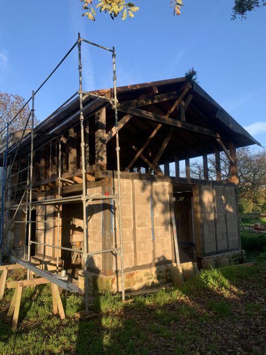 En attendant Alex peaufine les détails pour que le chantier soit fin prêt (pose du parapluie et de la gouttière, réalisation des encadrements pour les fenêtres, pose de l’osb pour avoir un plancher intermédiaire et appro des blocs en haut).