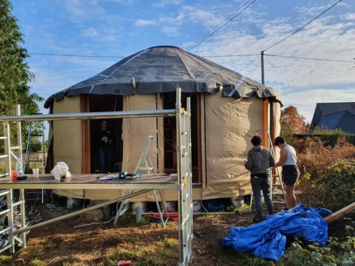 Il reste maintenant à tirer et nouer les cordes du toit pour bien fixer...Afficher la suite La yourte avance bien ! On a pu profiter du temps ensoleillé de mardi pour finir les murs extérieurs, remettre les toiles qui s'étaient envolées, poser l'isolant sur le toit et positionner la toile extérieur du toit.