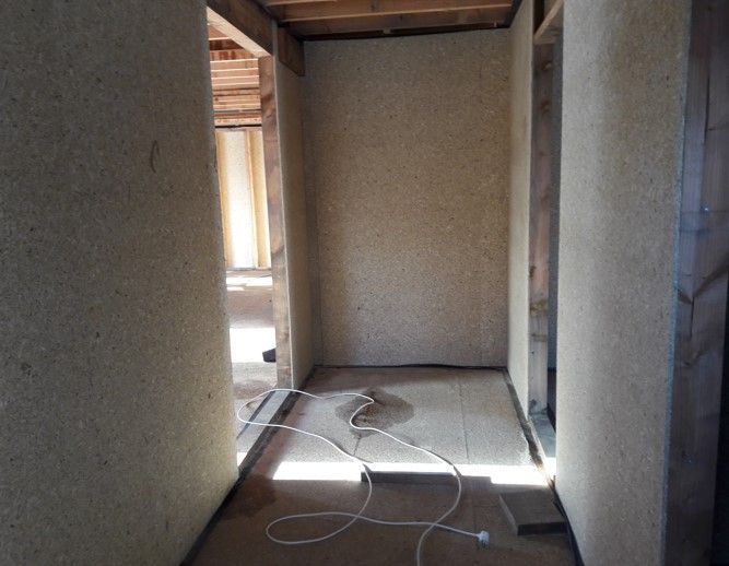 Pendant ces dernières semaines, nous avons eu quelques activités d'entretien sur le terrain (transplantation d'arbres fruitiers, taillage de haies...) et aussi nous avons mis des panneaux MFP en contreventement sur une face de chacune des cloisons intérieures. Cela délimite bien les futures pièces.