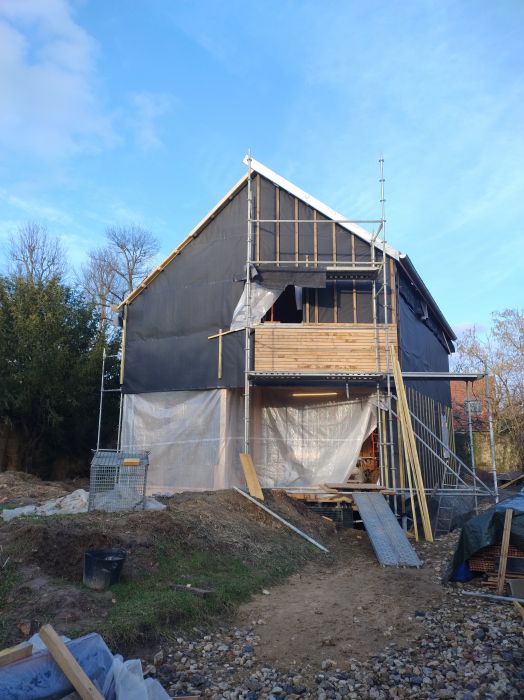 Nous avons contreventé et isolé entièrement le pignon sud de la maison, la couverture presque achevée et on a entamé le bardage !