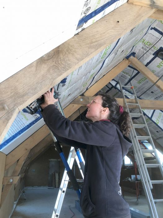 Salut à tous, voici des actualités du chantier "habillage de rampants en fermacell". En deux jours, on a posé un tiers des plaques, avec déjà beaucoup d'améliorations dans la façon de faire. On a laissé tomber le lève-plaques bricolé (dans sa version originale, il ne prenait que des...Afficher la suite Salut à tous, voici des actualités du chantier "habillage de rampants en fermacell". En deux jours, on a posé un tiers des plaques, avec déjà beaucoup d'améliorations dans la façon de faire. On a laissé tomber le lève-plaques bricolé (dans sa version originale, il ne prenait que des grandes plaques) et on fait tout désormais à l'échafaudage, en utilisant des étais de plaquiste pour maintenir les plaques en place. Beaucoup plus simple à régler... par contre l'inconvénient est qu'il faut être assez nombreux.
