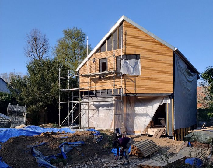 - Reporté en juin : bois brûlé (bardage du RDC) et application des enduits terre